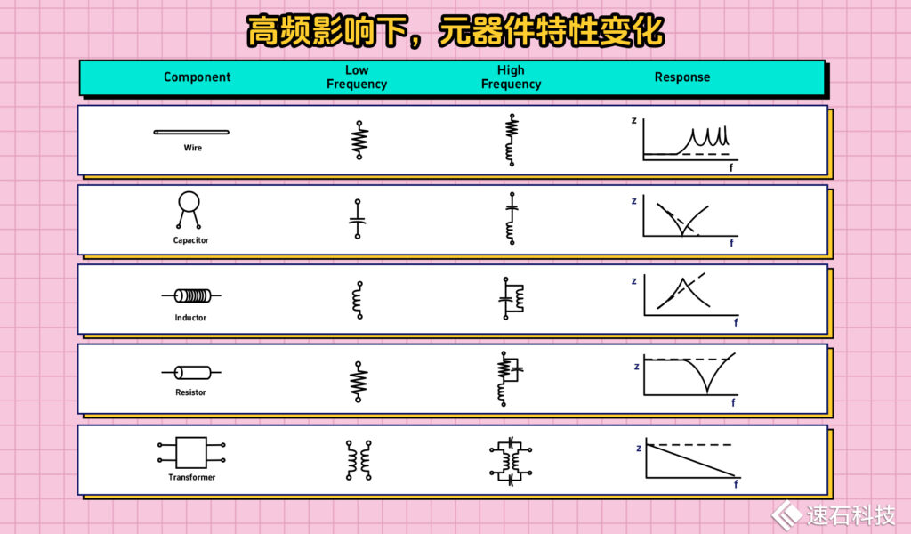 而在高頻影響下,所有的器件都是電阻、電感和電容的組合,存在寄生參數。