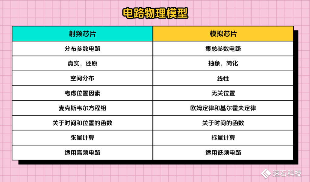 總結一下,射頻芯片與模擬芯片在電路物理模型上的差異: