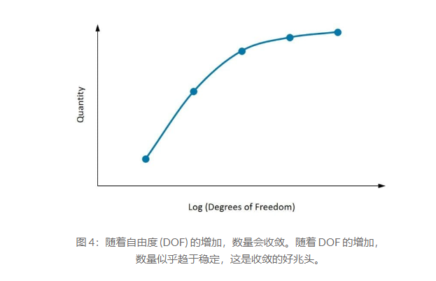 上圖顯示了一個數量隨著自由度的增加而收斂。如圖所示,首先確定感興趣的數量很重要。至少需要考慮三個點,并且隨著網格密度的增加,感興趣的數量開始收斂到特定值。如果兩個后續的網格細化沒有顯著改變結果,那么可以假設結果已經收斂。