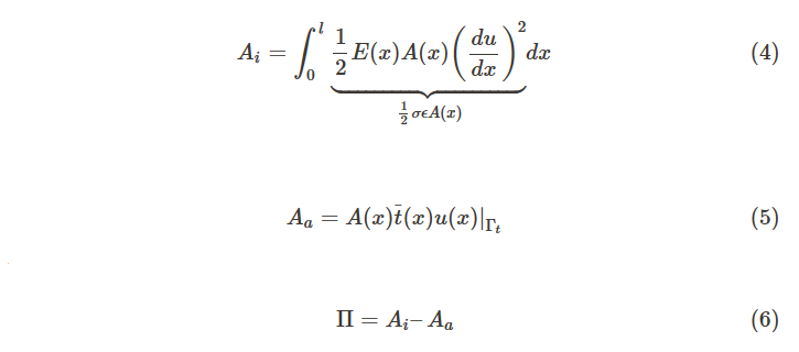 有限元分析也可以用變分原理來執行。在一維彈性靜力學的情況下,最小勢能對于保守系統是有彈性的。平衡位置是穩定的,如果系統的勢能π是最小的。穩定位置的每一個無窮小干擾都會導致能量不利狀態,并意味著恢復反應。一個簡單的例子是立在地上的普通玻璃瓶,它的勢能最小。如果它倒下,除了一聲巨響,什么也不會發生。如果它站在桌子的??角落并掉到地上,它很可能會摔壞,因為它會將更多的能量帶向地面。對于變分原理,我們利用了這個事實。能量水平越低,得到錯誤解的可能性就越小??倓菽堞邢到y的功由內力(應變能)組成
