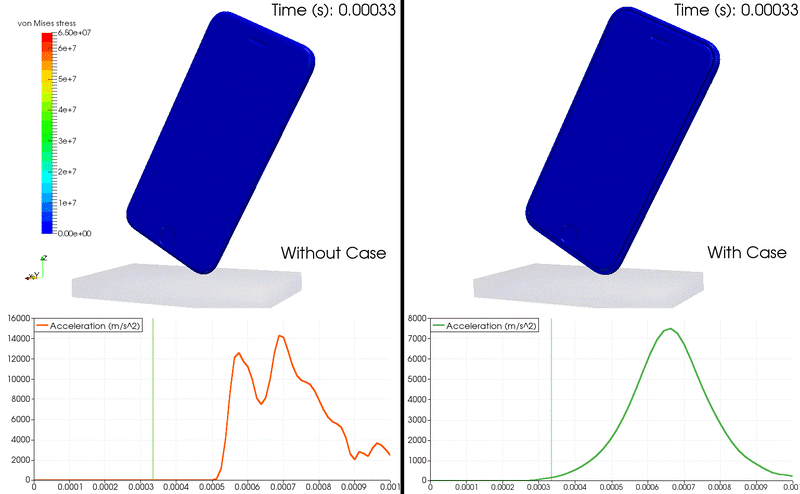 動畫 1:iPhone 掉落 FEA 使用加速度圖顯示 von Mises 應力及其在手機內部的增長。